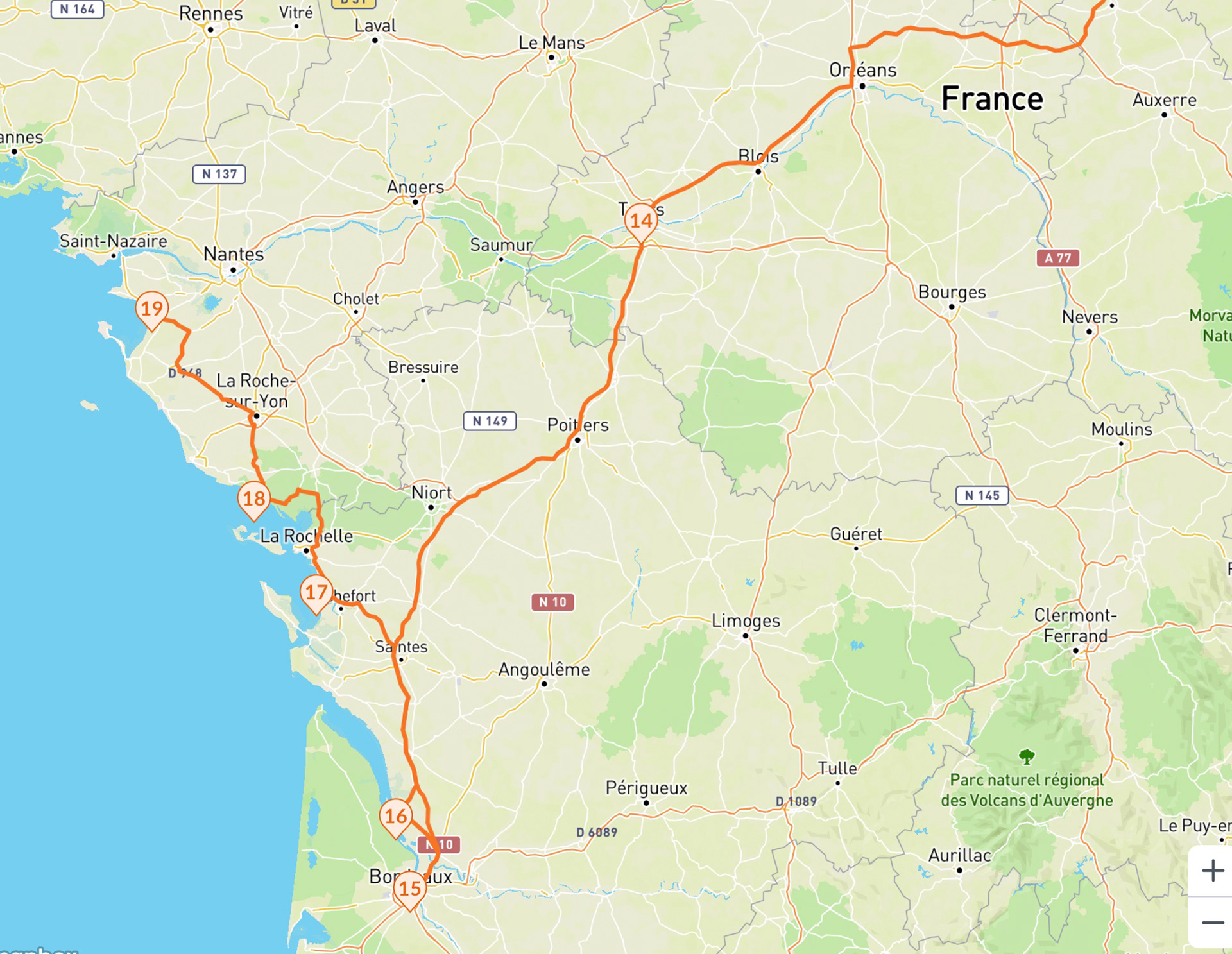 Something about this name, thought we had been here before. Jim confirmed that we had, even had the date. We stayed at a different Park up, but as soon as we walked into town, the memories all came back. La Turballe is a lovely town, and it has a marina and a great beach. We had a wander around and Lorraine did a little present shopping. We had a cup of tea and a plate of chips as we waited on the Pizzeria opening. Although a little cooler it was nice to sit out back at the park up. We went to bed and watched a couple of episodes of the Madame Blanc mysteries. It rained most of the night. As rain was forecast we decided to make today a service day and drove to a Super U supermarket, walked into town to do some laundry, Brunch and some shopping for groceries. Our next park up was only a few miles down the road so there was no hurry.