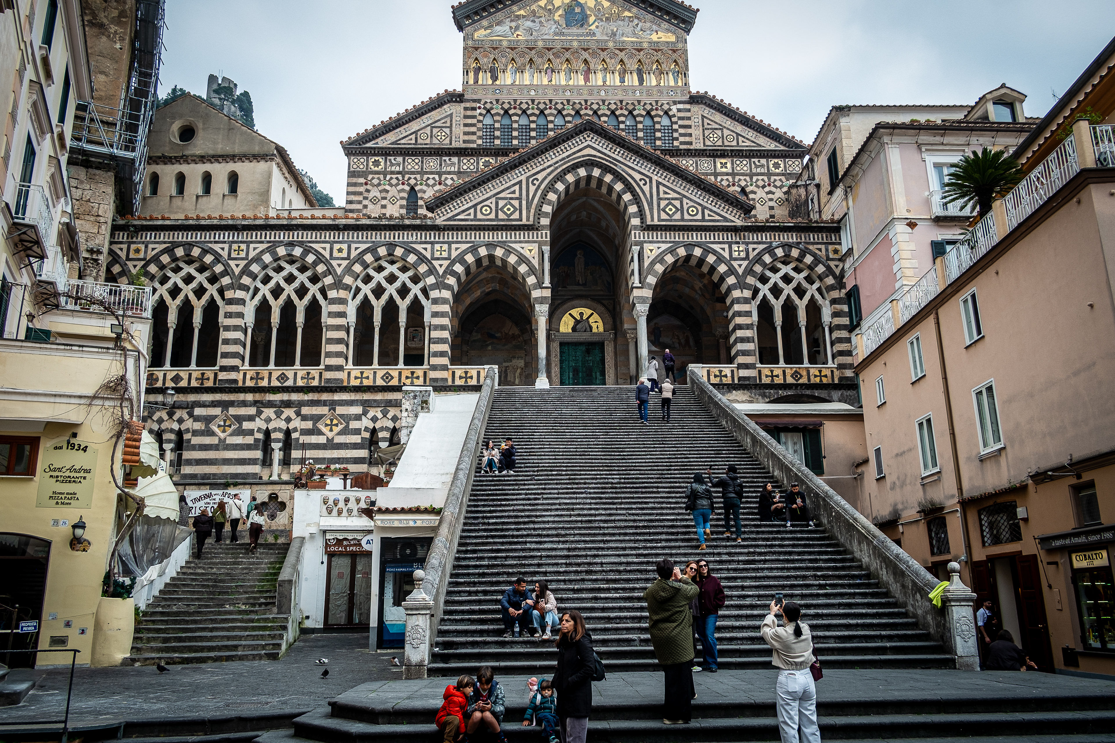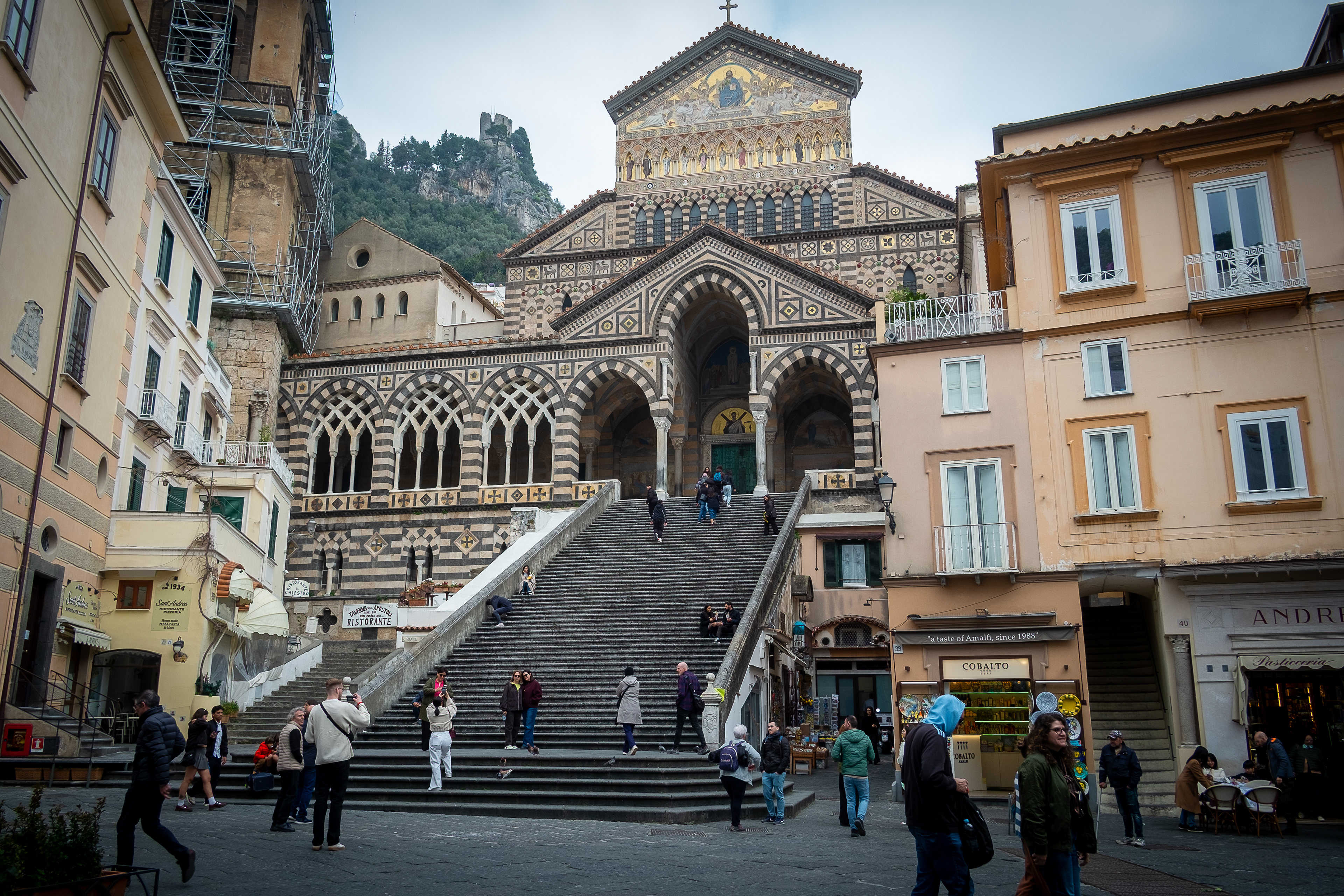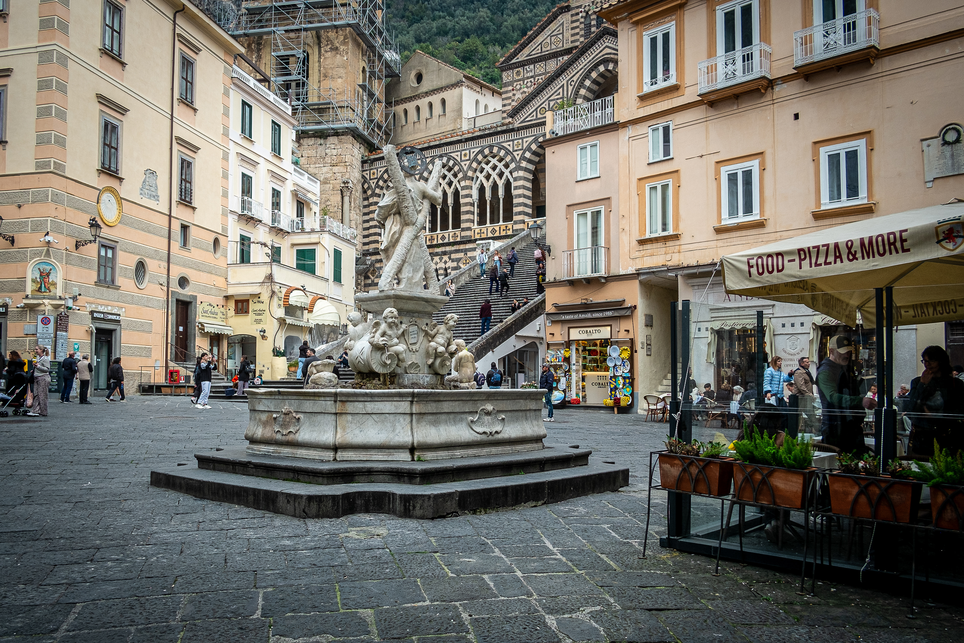 The following day, Saturday we decided that we should explore and headed to Sorrento via the same regional train. When we arrived a Sorrento, Lorraine spotted a hop on hop of bus, for just 10 euro’s each. However it wasn't like a city hop on hop off this was around the Almafi coast. The road was an adventure and hats off to the driver. No way would you like to take a motor home here, anyway they are not allowed at certain times of the day. We got talking to a young girl from London, she and her partner got off the bus at Positano. But we didn’t think that we could get down to the bottom. How would we would ever get back up to the road again. It was so steep. We opted to stay on the bus. When we arrived at Almafi, It was much more doable, down at sea level. We walked to the town square and had a lovely lemon yogurt ice-cream in the old square.